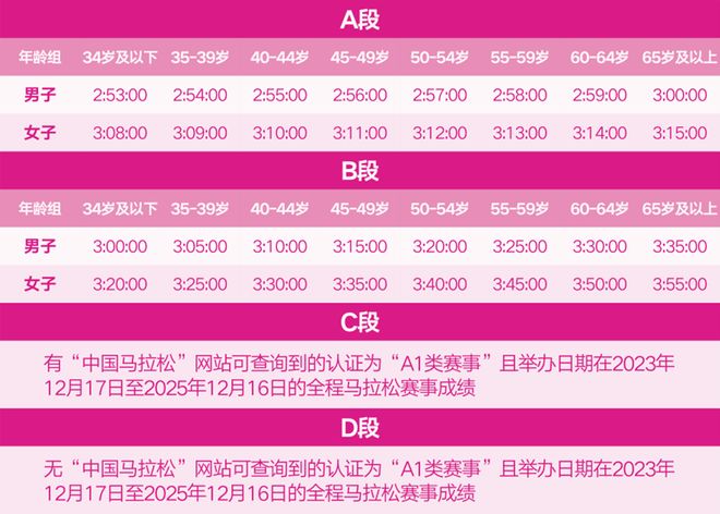 设置A、B、C、D四个抽签段,根据不同成绩标准分配不同比例的抽签名额:可抽签名额总数的20%用于A抽签段;30%用于B抽签段;45%用于C段抽签,5%用于D段抽签。名额分配更透明,也保证了不同水平跑者都有更公平的参赛机会(尤其也让更多大众跑者有机会参与到金标赛事中来)。